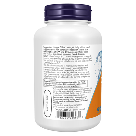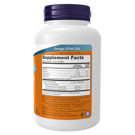 NOW 超級奧米加 3-D是我們最強效的奧米加-3配方,每粒軟膠囊含 600mg EPA 和 300mg DHA。本產品加入檸檬油調味,並提供 1000IU 維生素D-3。