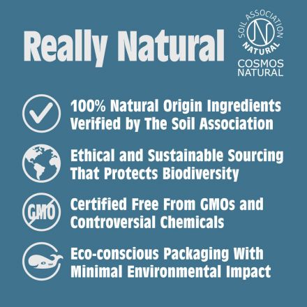 COSMOS 天然認證:確保環保製程、非基因改造成分、無爭議化學品以及可回收包裝。