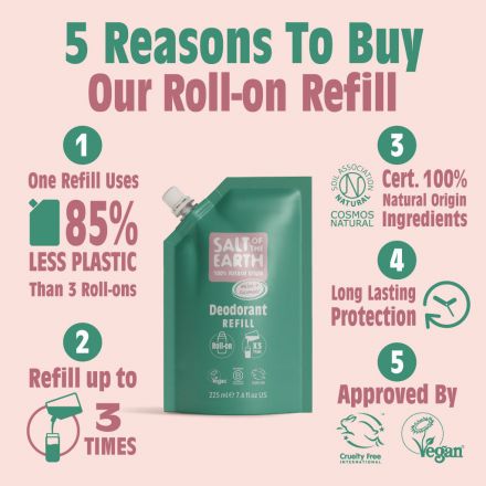 使用 Salt of the Earth 蜜瓜青瓜味 225 毫升走珠除臭劑補充裝,減少塑膠垃圾並節省資金